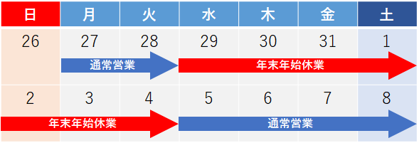 2021年12月29日(水)~2022年1月4日(火)までコールセンター業務におきましては、年末年始期間中も通常どおり営業いたします。