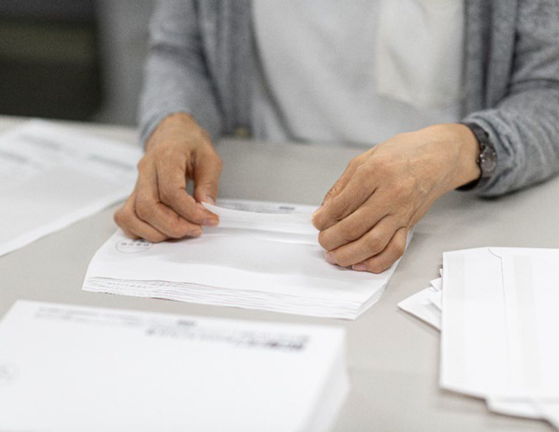 ISMSに準拠した独自の情報セキュリティ体制のもと、ダイレクトメールを発送。作業手順の標準化によって、効率的な業務体制を構築しています。有価証券やチケットの発送では、封入直前の写真撮影に加え、作業を動画で記録。徹底したトレーサビリティも確保しています。